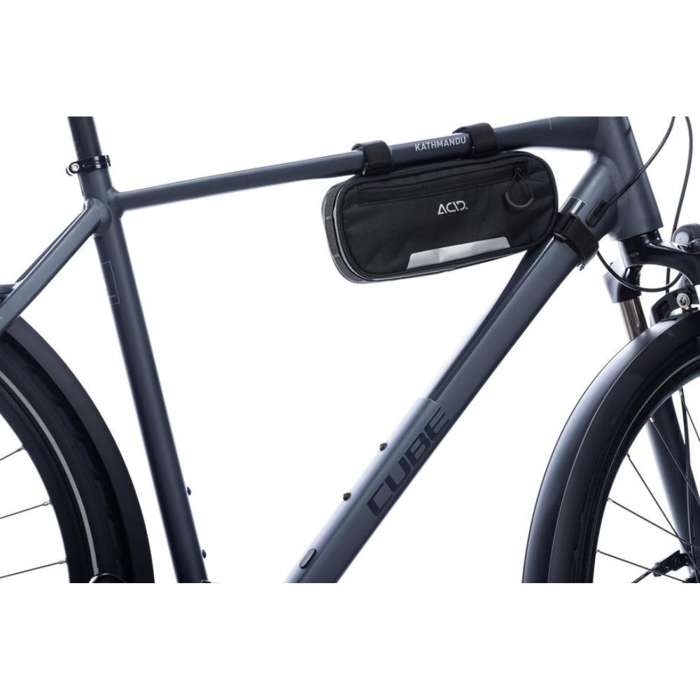 Smart rammetaske fra Cube der kan monteres på cykler som du ønsker det. Med de medfølgende velcro stropper er der flere muligheder alt afhængig af plads og behov. Tasken er på 1,2 liter og materialet er fri for PVC. Størrelsen er (HxBxL) 240x50x110.