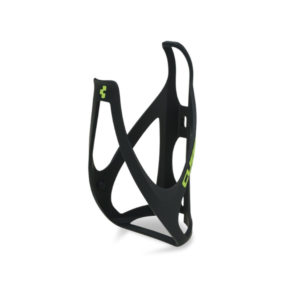 Cube flaskeholder i mat sort med grøn skrift og logo. Flaskeholderen er universal og vejer kun 36 gram.