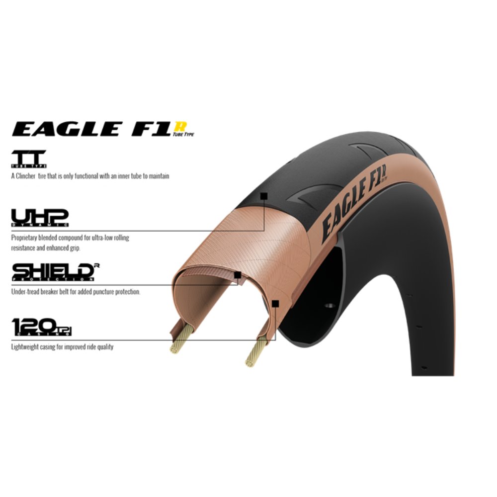 Goodyear Eagle F1R Tubeless dæk er det ultimative løbsdæk for dig der vil køre hurtigt. Dækket er fremstillet med de fineste produkter fra øverste hylde så selvom her er tale om et letvægtsdæk på kun 280 gram (700x25C) får du både Shield Protection mod punkteringer og hele 120TPI (tråde per enhed). Dette helt nye dæk er bygget med en blanding af syntetisk og naturligt gummi tilsat Graphene og resultatet taler for sig selv: