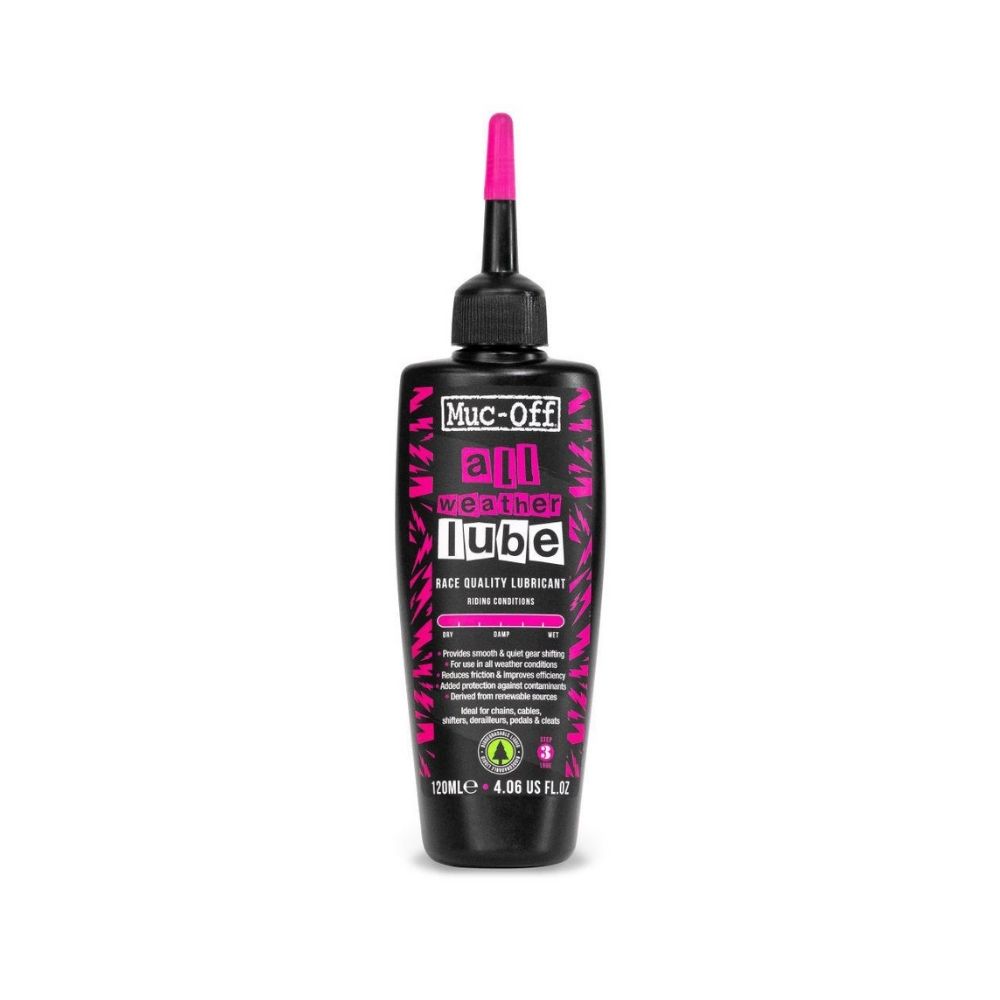Muc-Off all-weather smørremiddel til din cykelkæde. Dette smørremiddel er lidt tykkere end en dry lube men ikke lige så tyk som en Wet lube. Det gør den perfekt til overgangs vejret hvor en dry lube er lige i underkanten og du forlanger det bedste af din kæde. Indholdet er 120 ml.